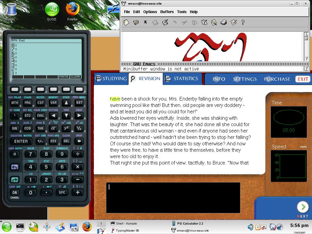 I also installed my favorite(well almost favorite) Typing tutor in linux(see pic on right) Anyway my all time favorite ktouch in kde (linux) just rocks. Also in the screen shot you can see the scientific calculator and emacs;