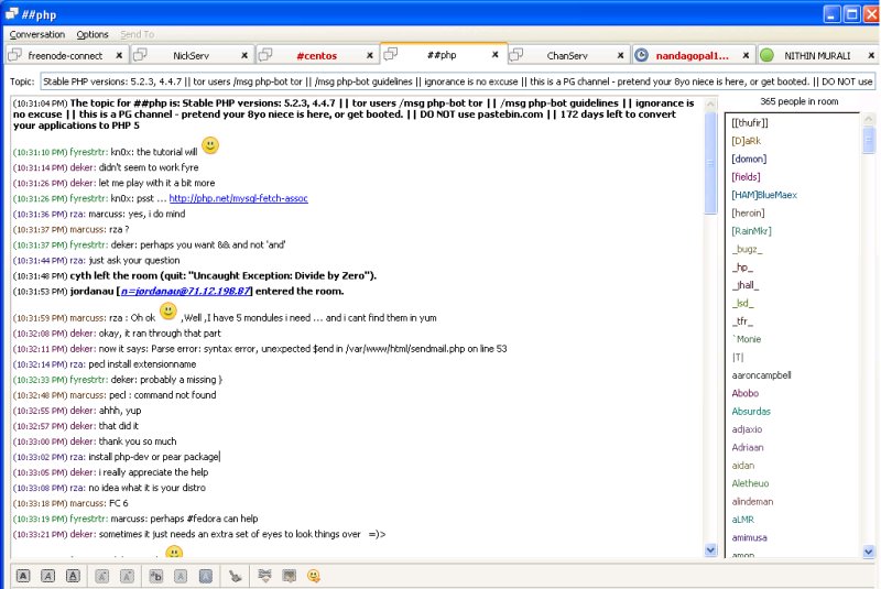 I just logged in and it had thousands of rooms(yeah, u heard it right)And I first logged in to two rooms, namely php and centos.Now, note that sometimes, the nickname that you use might have been used by someone else