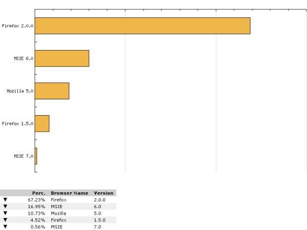 About 84 % of visitors to this blog, use Firefox or Mozilla based browsers, while visiting this site. Firefox 2.0.x is the browser used by the maximum number(67.23 %) of visitors. The bar at the top(the longest one) depicts this.