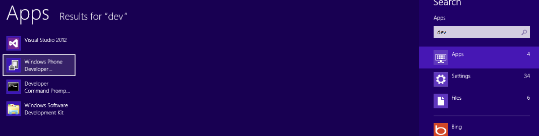 - Launch the DEV tools ( Go to Windows 8 start menu and type dev. Look for ‘Windows Phone Developer Registration’. See screenshot below)