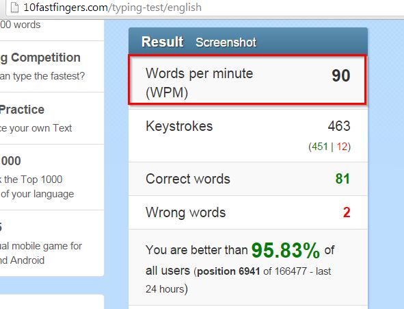 Flexing my fingers is something I like to do, when I get some free time. I guess 90 wpm ( words per minute ) sounds pretty decent. Since the test includes only alphabets, the high score seems to be okay, as of now. But I need to work on numbers and other special characters and target for 100 words per minute, on a consistent basis.