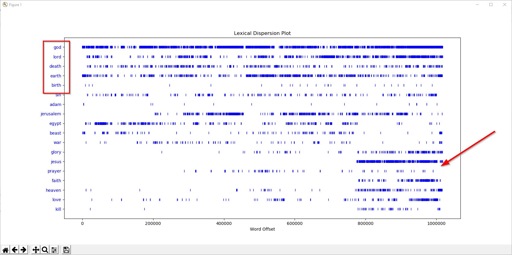 import matplotlib.pyplot as pltimport nltknltk.data.path.append("E:\\dev\\lib\\python\\nltk_data")f=open(r"F:\resources\bible\ylt\ylt.txt",'rU')raw=f.read()tokens = nltk.word_tokenize(raw.lower())text = nltk.Text(tokens)text.dispersion_plot(["god", "lord", "death" ,"earth", "birth", "sin", "adam", "jerusalem" , "egypt" , "beast" , "war","glory", "jesus" , "prayer", "faith", "heaven" , "love","kill" ])